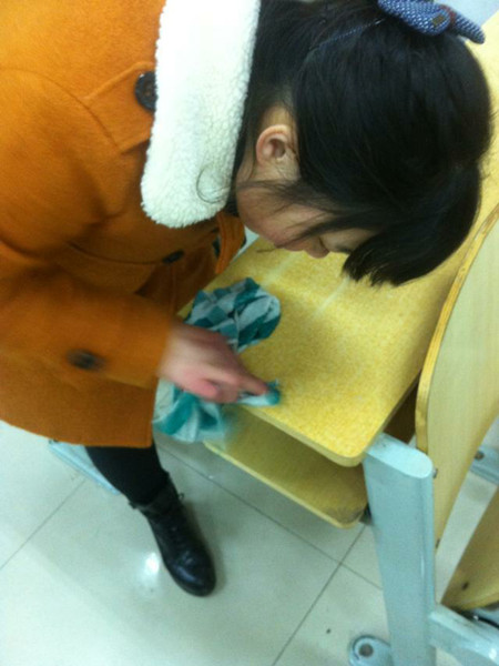 结束一天的课程后,志愿者们带着抹布、橡皮、洗洁精、拖把、扫帚等清洁工具来到工科C楼教室,清理教室的桌面、椅背上的涂鸦文字。志愿者们进行了任务分工后,有条不紊得开始打扫教室。天色渐晚,自来水十分冰冷,但同学们不畏严寒,齐心协力,各司其职,一遍又一遍精心地擦拭着桌面上的笔迹、污垢。活动中每一位同学都迸发出了十足的热情,细心的打扫和清洁着桌面。在一个小时的时间里,教室桌面、地面恢复整洁面孔,工科楼教室焕然一新。